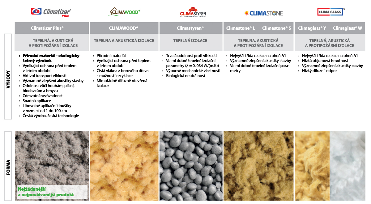 Nevyhovuje vám Climatizer Plus? Možná vám bude vyhovovat izolace s jinými vlastnostmi, podívejte se nakompletní přehled našich foukaných izolací.